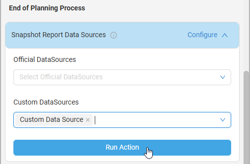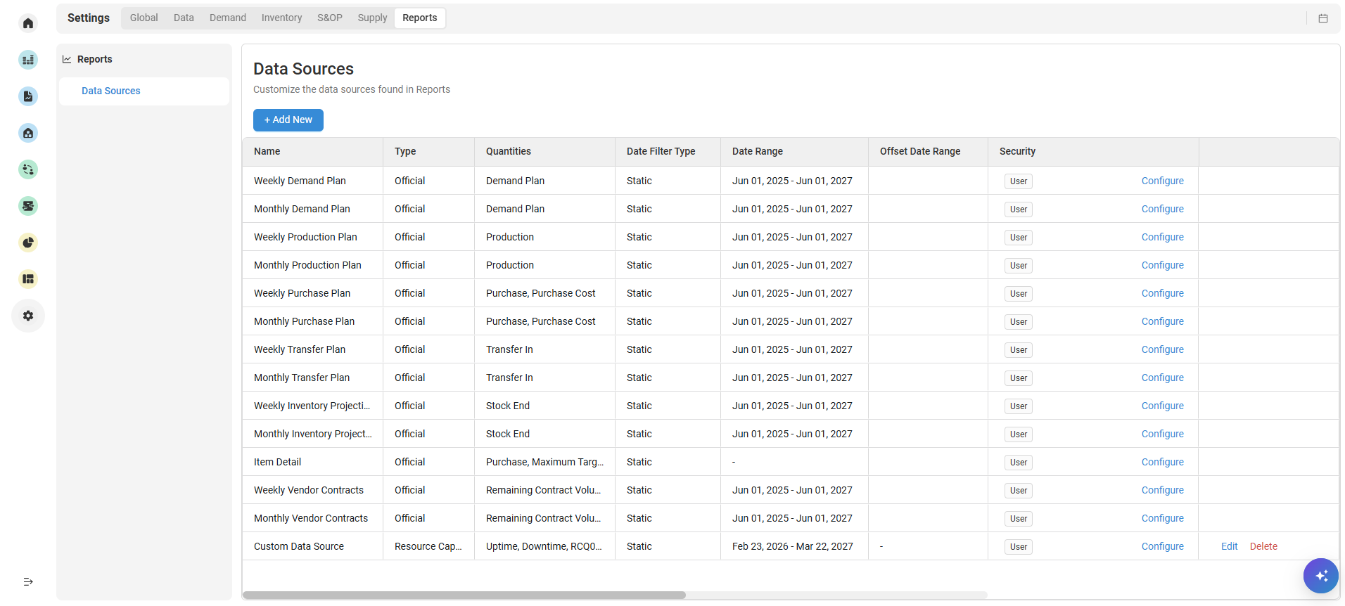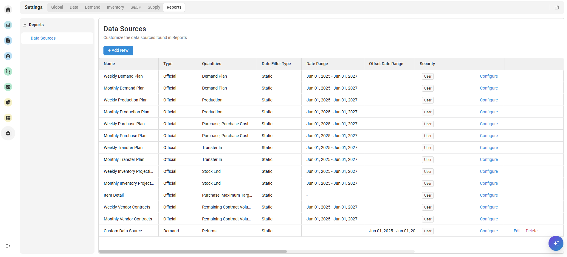 When a data source is created, by default the security role will be set to visible to all users. If you would like to change the security of a data source, click the Configure button and use the Visible to Users and Visible to Roles dropdowns to select different security options.