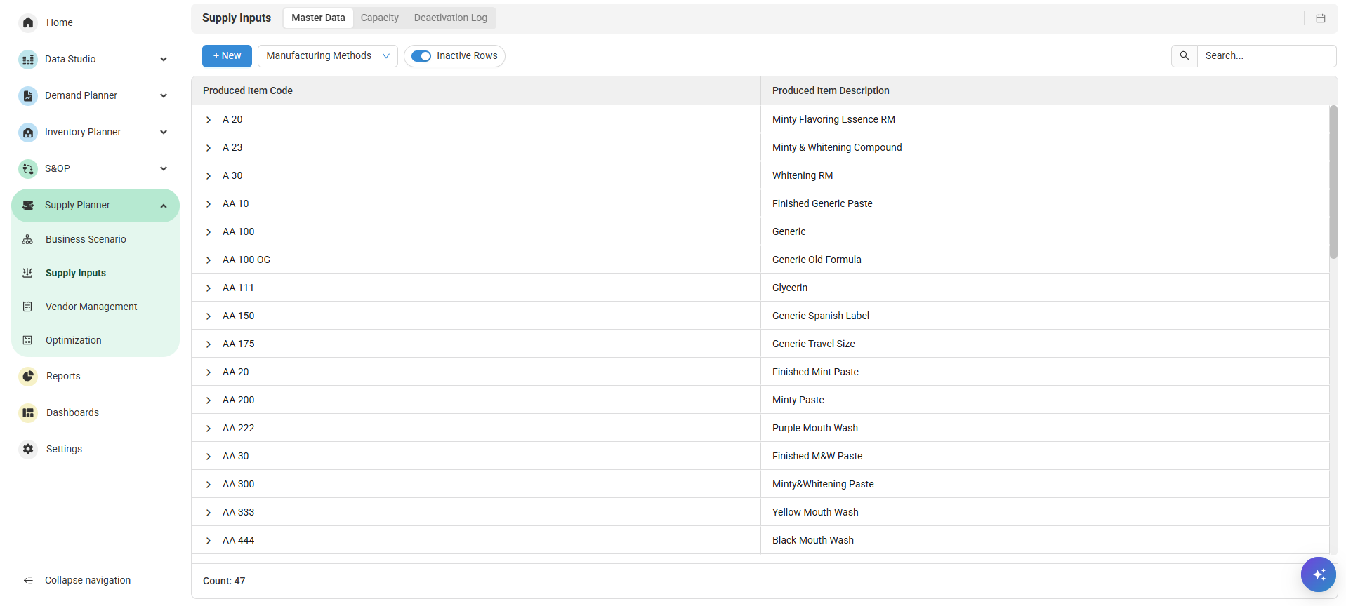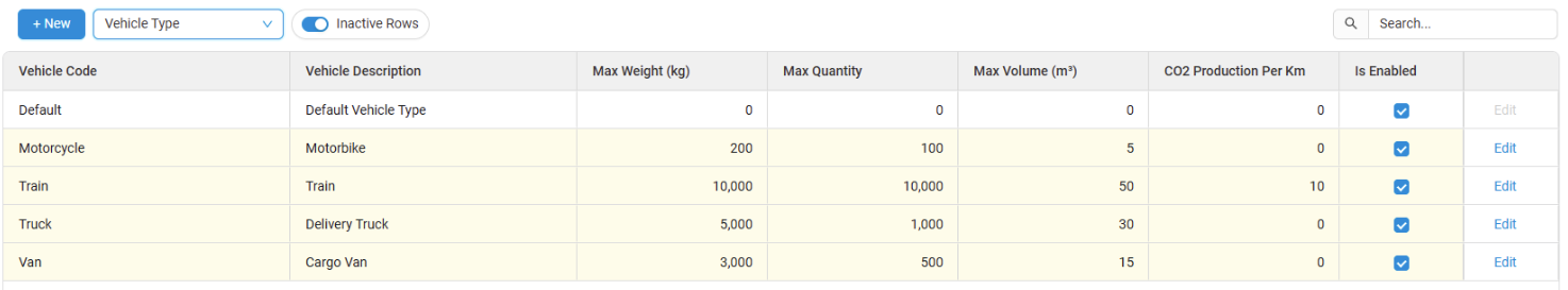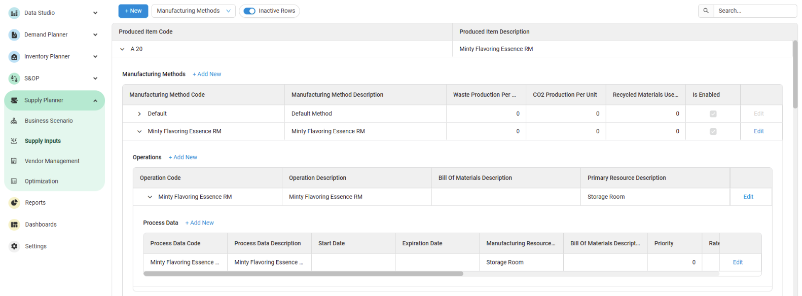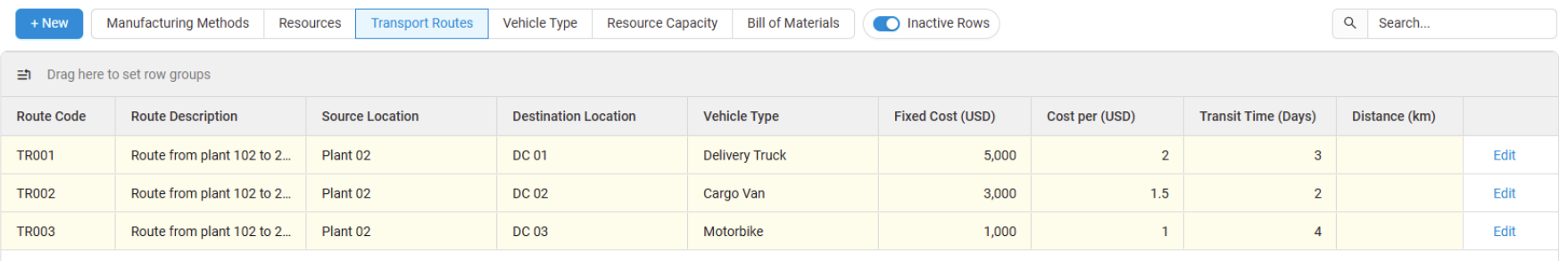 Manufacturing Methods, Resources, Transport Routes, and Vehicle Type have the Inactive Rows toggle option. Toggling on will hide any inactive rows.