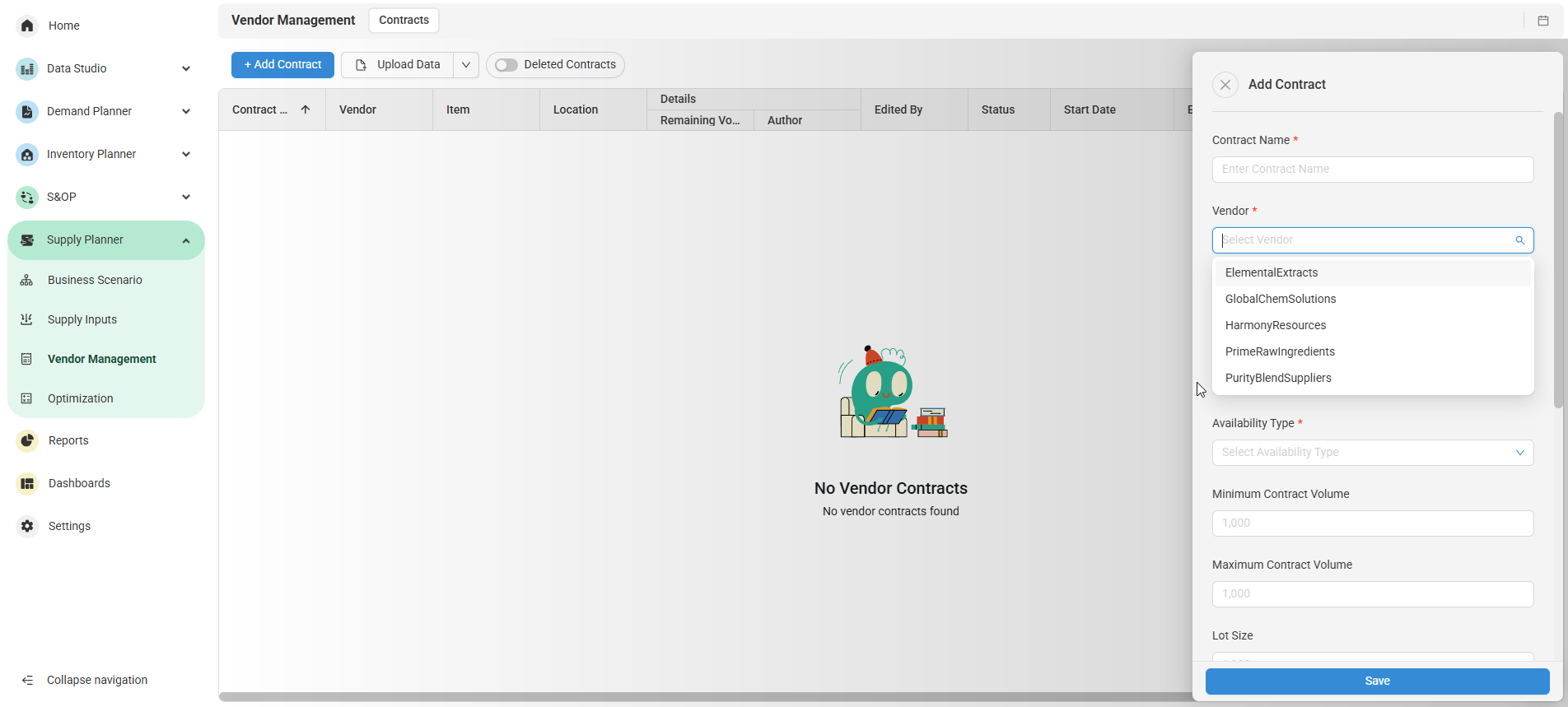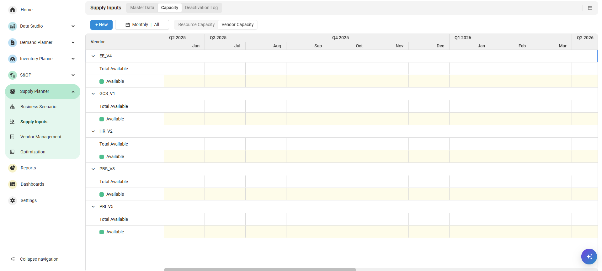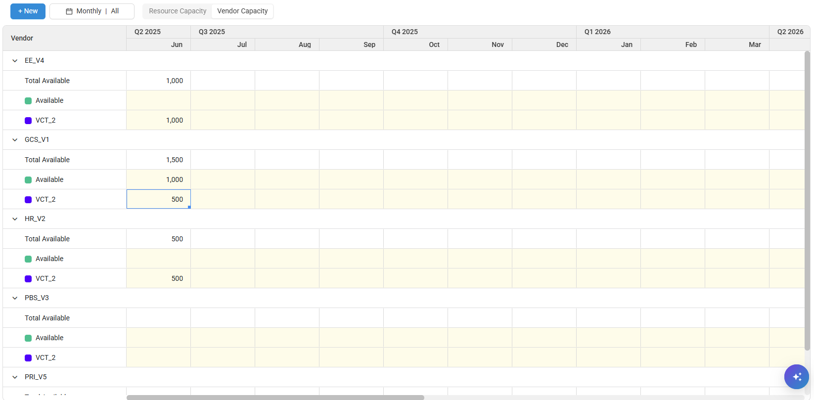 Create and manage Vendor Capacity from the Vendor Capacity tab under Capacity.