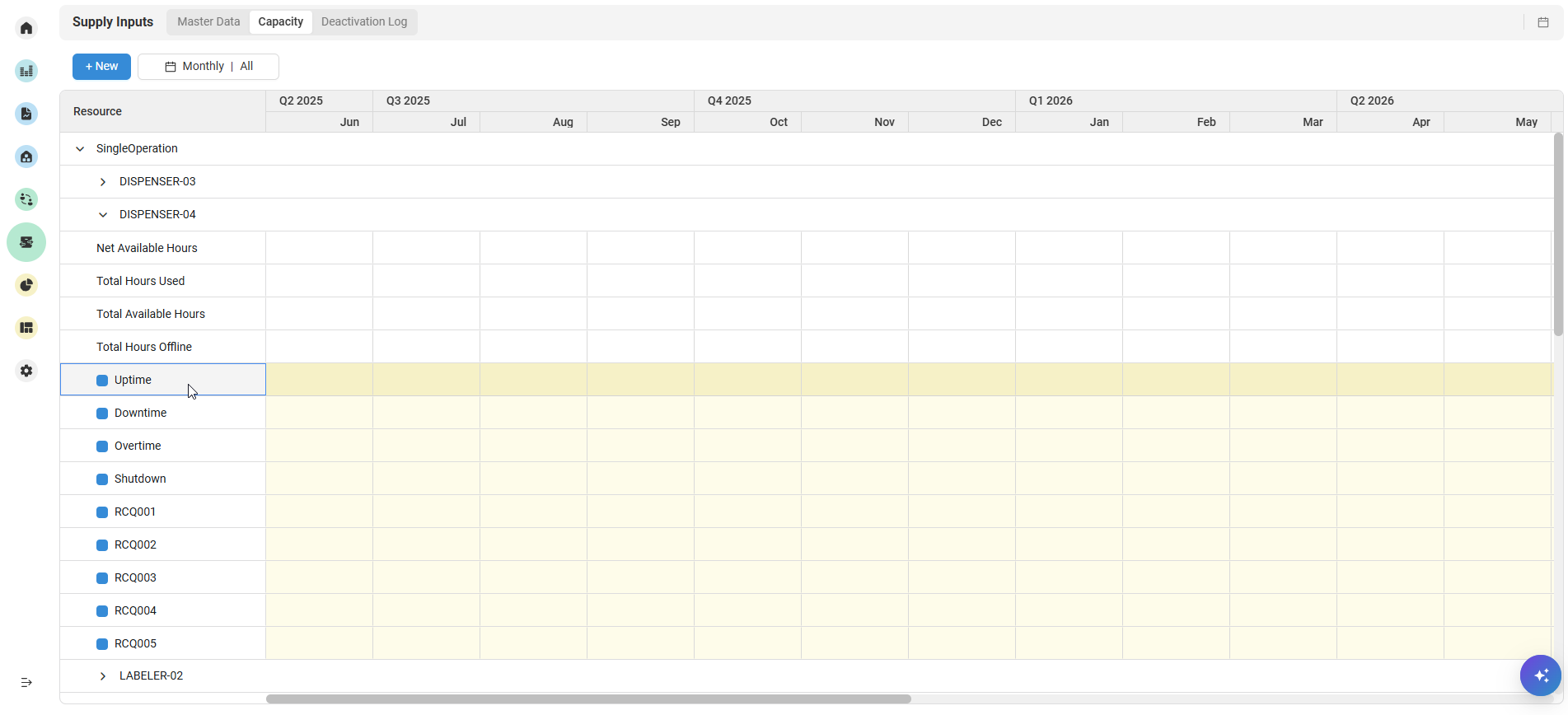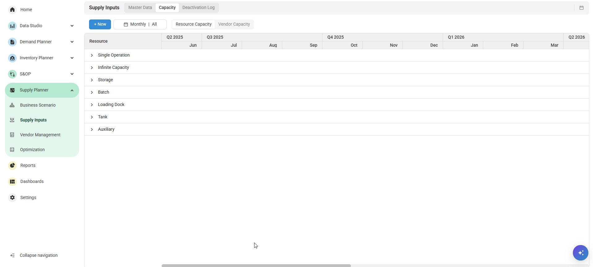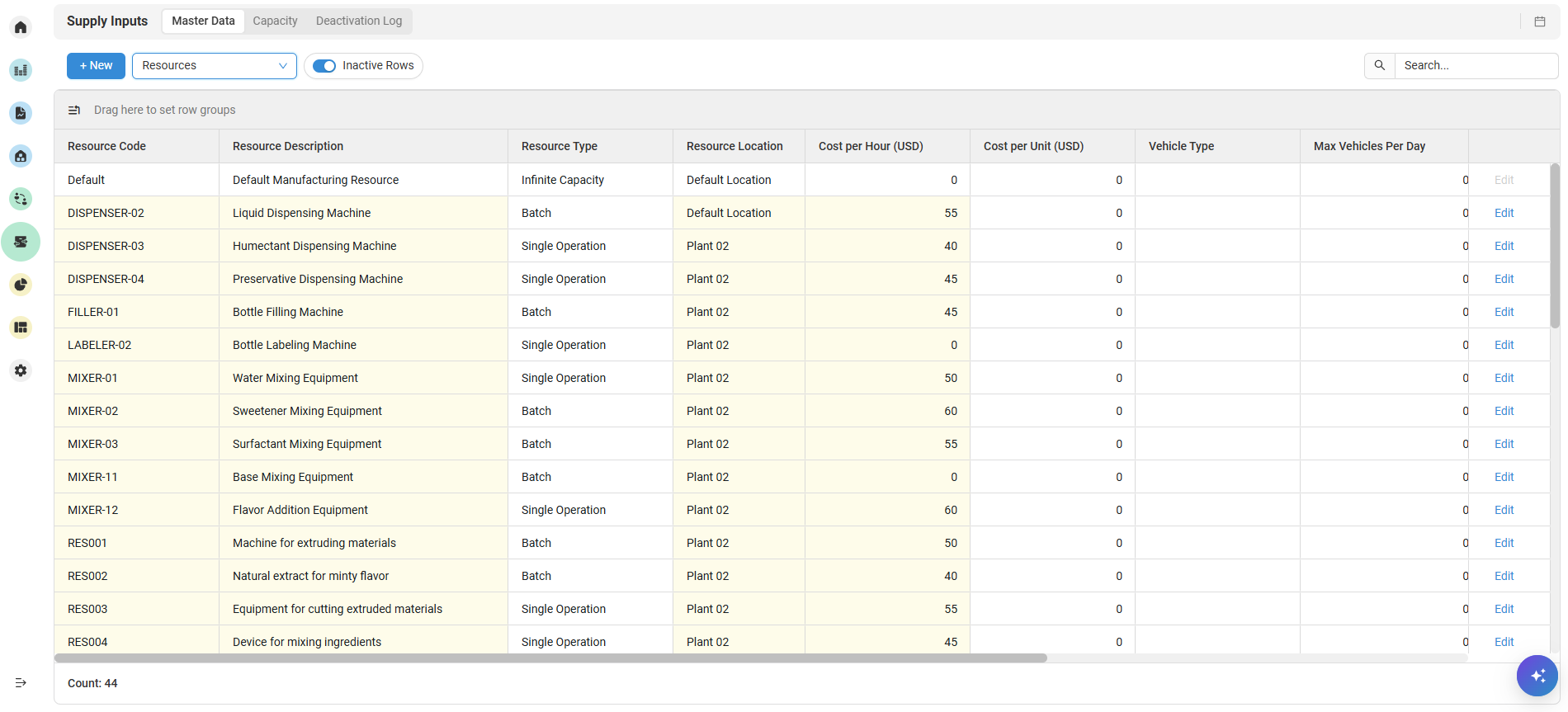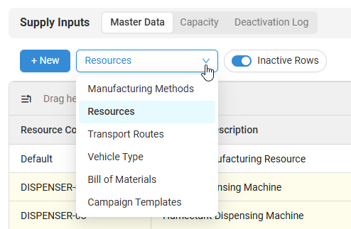 You can view Supply Input Resources by selecting Resources from the Master Data dropdown. Going to the Capacity tab will allow you to edit Resource capacity for defined quantities and display quantities only in their configured resource categories.