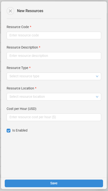 View, Edit and Create Supply Resources. From the Edit Resources drawer you can edit the Resource Code, Resource Description, Resource Type, Resource Location, Cost per Hour, Vehicle Type, Waste Production per Hour, CO2 Production per Hour, if it is a Continuous Resource (Yes or No), and if the Resource is Enabled (checked or unchecked).