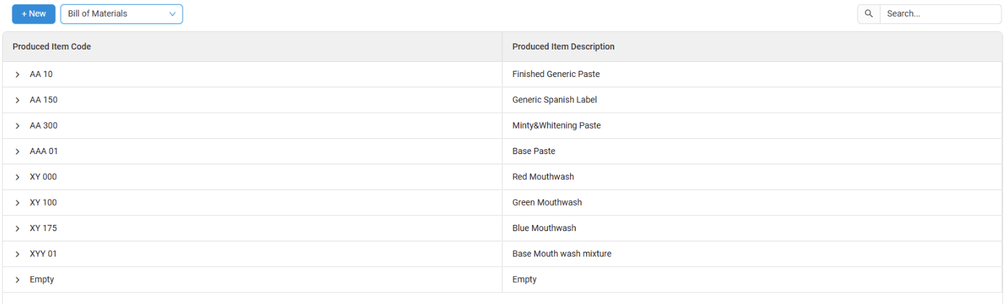- The new created Manufacturing Method will appear under the Produced Item Code for that Product in the Manufacturing Methods list. Click the dropdown arrow to view the Manufacturing Method.