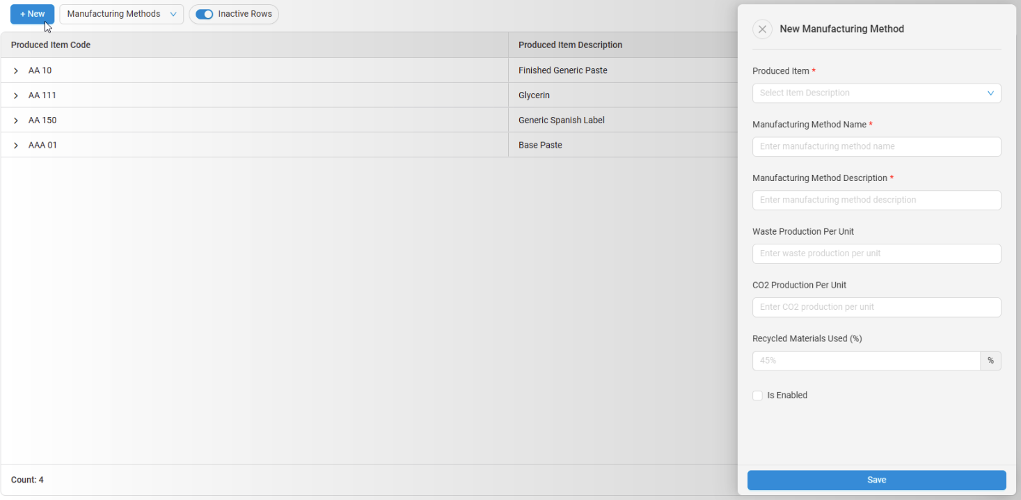 - There are two ways to create a new Manufacturing Method, you can select an Item from the Produced Item Code list and click the dropdown arrow, then click +Add New, or you can click the New button to launch the New Manufacturing Method.