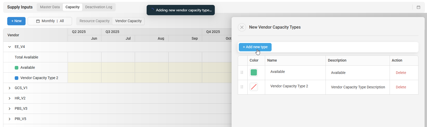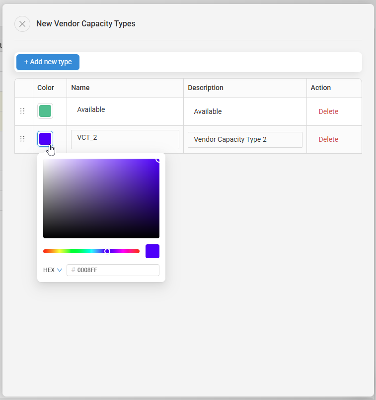 - Create a Name and Description for the new vendor capacity type. You can also optionally select a color. Under the Action column you can delete a vendor capacity type.