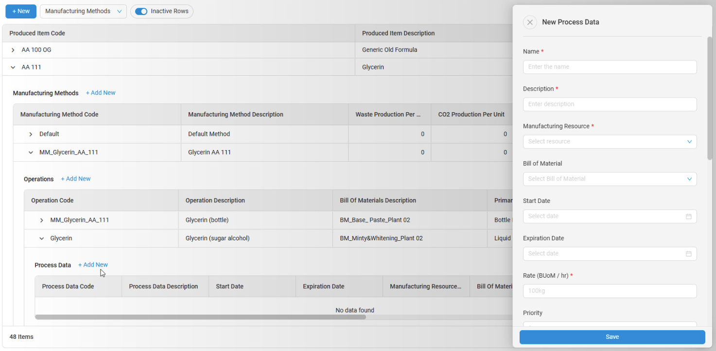 - After creating an Operation, you can add Process data to the Operation by clicking the +Add New next to the Process Data title after clicking the dropdown arrow for that Operation. Here you will create a Name Description, select a Manufacturing Resource, optionally select a Bill of Material, Start Date and Expiration Date, create a Rate of BUoM / hr, and optionally create a priority, lot size, minimum run size, setup time, lead time, delay time, minimum run time, and incremental run time.