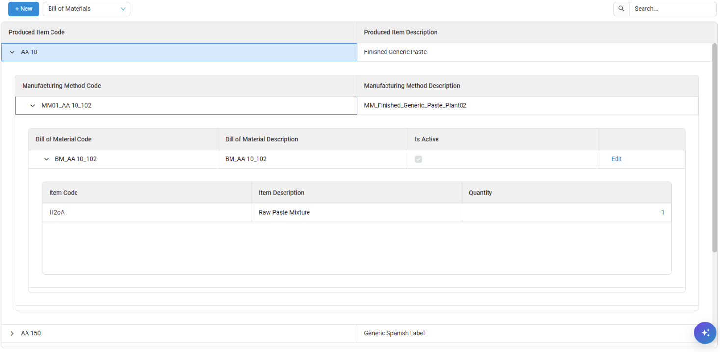 - Click New to create a BOM for the Master Data.