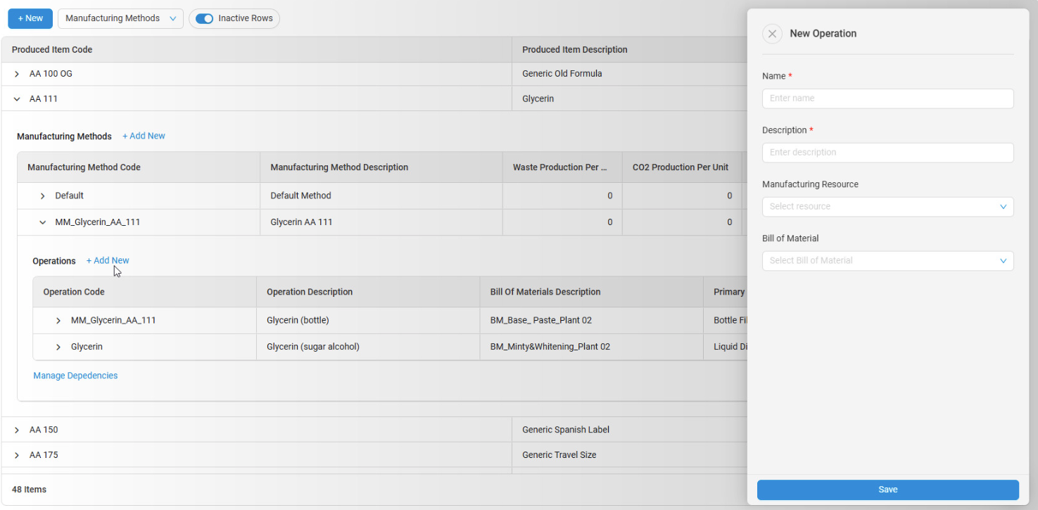 - From here, type a Name and Description for the Operation, then you can optionally select a Manufacturing Resource and a Bill of Materials. Click Save.