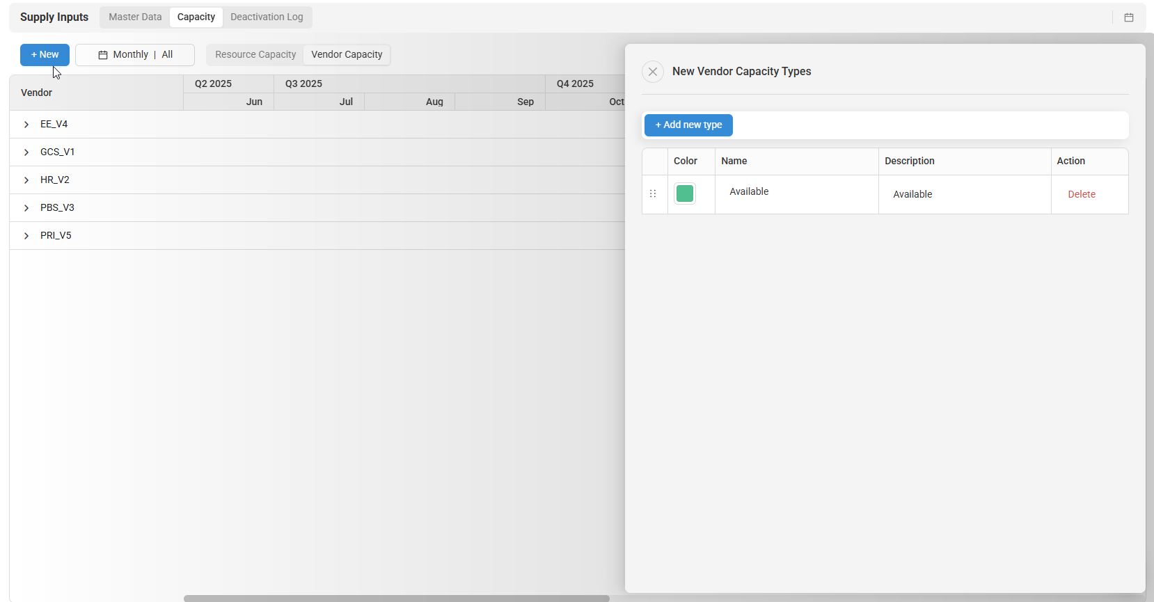 - Click +Add new type to start creating a new vendor capacity type. Changes made in this drawer will be automatically saved and reflected in the Vendor Capacity grid.