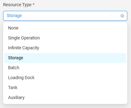 - Storage (Maximum Capacity, Units, Resource Location): Custom units of measure (such as Pallets) are available in the Storage Capacity unit dropdown when configuring Storage type Resources, allowing warehouse capacity to be defined using custom units.