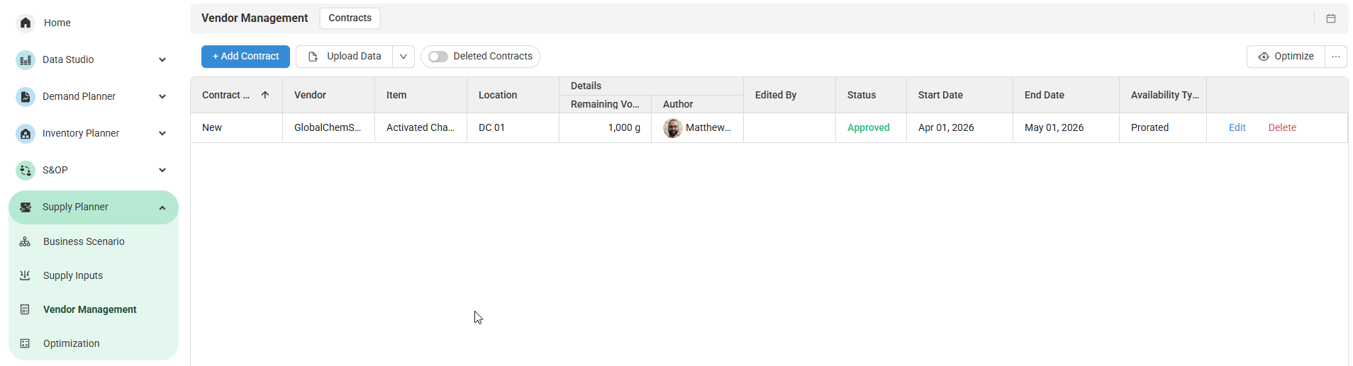 - The new vendor capacity type will appear under each Vendor. These are the Vendors listed under the Vendor dropdown in the Contract drawer of Vendor Management.